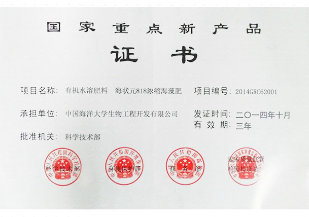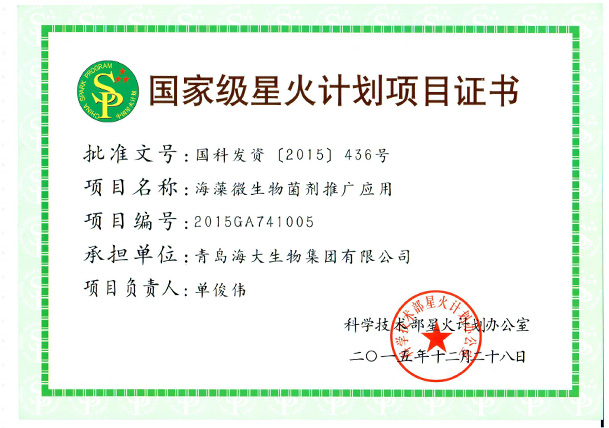 國(guó)家級(jí)星火計(jì)劃項(xiàng)目證書