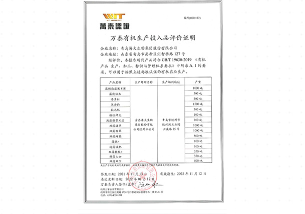 萬(wàn)泰有機(jī)生產(chǎn)投入品評(píng)價(jià)證明